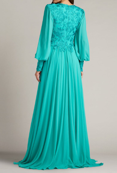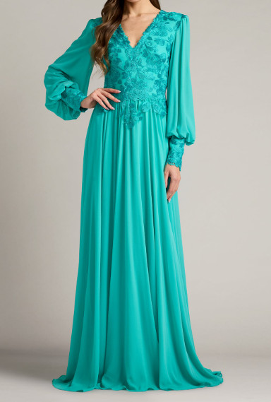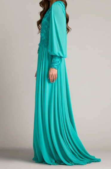 Tadashi Shoji タダシショージ Delfina 刺繍レース ビショップスリーブ ロングドレス グリーン 演奏会・パーティー対応
