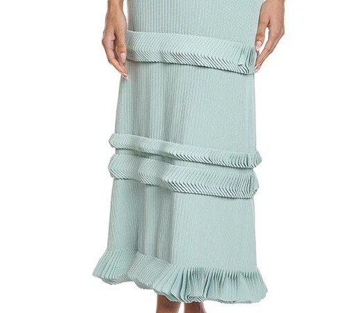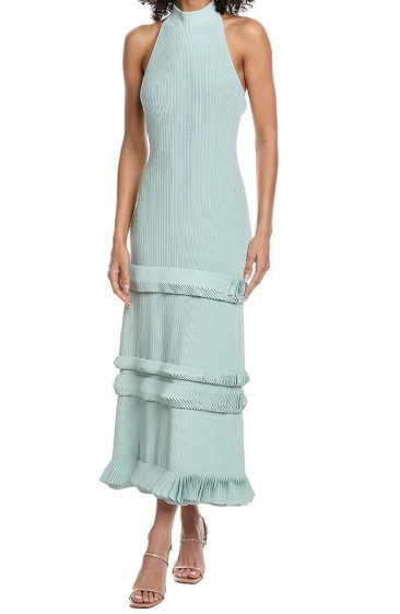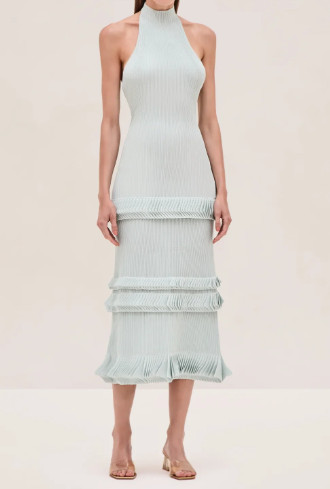 柔らかく伸びのある高級ニットのデザインで、身体のラインを優しく包み込みながら、美しいシルエットを描きます。特に目を惹くのは、全体に施された立体プリーツディテール。光を受けてふわりと揺れ、エレガントな存在感を纏います。ハイネックのホルターデザインがデコルテと肩を美しく見せ、バックスタイルは大胆なオープンバックで大人の女性らしい艶感を演出。