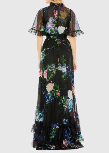 Mac Duggal マックドゥガル 花柄 シフォン ラッフルハイネック ロングフォーマルドレス ブラック パーティー・演奏会対応