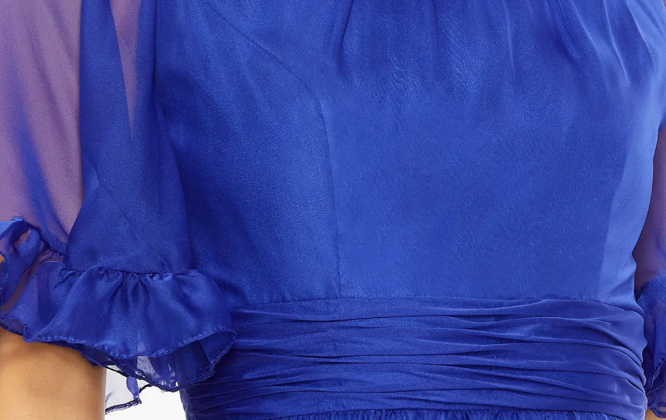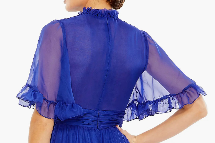 このドレスの最大の魅力は、「シフォン素材とフリルによる立体的な動き」です。軽やかなオーガンザ・シフォン素材が空気を含むように揺れ、ラッフルディテールが層を作ることで、視覚的な奥行きとリズムを生み出します。ハイネックデザインはクラシックな印象を与えつつ、透け感のある袖で抜け感をプラス。さらに、ハイローヘムにより足元に動きが生まれ、ロングドレスでありながら軽やかな印象に仕上がっています。ボディ部分は裏地付きで安心感があり、袖はシアー仕様で女性らしさを演出。シルエット・素材・ディテールがすべて計算された完成度の高いドレスです。