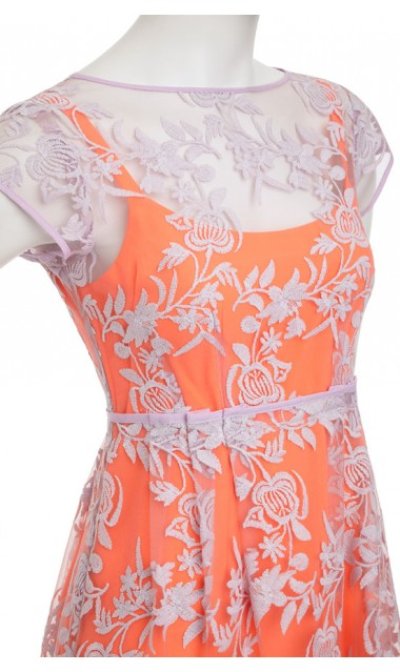 明るいオレンジのインナーに、エレガントな刺繍レースチュールを重ねた斬新なドレスです。
