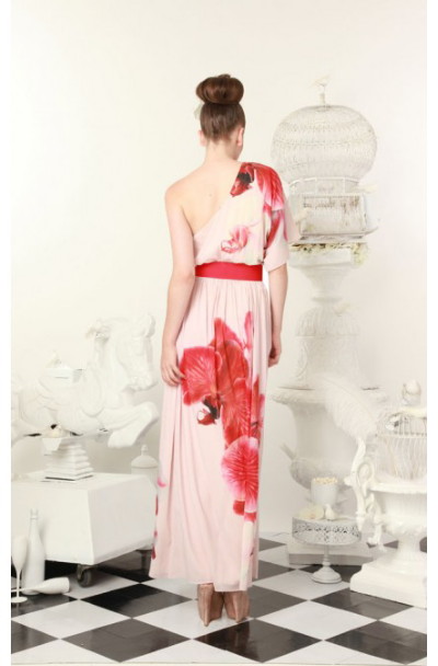 大きく大胆な花柄が美しいワンショルダードレスです。