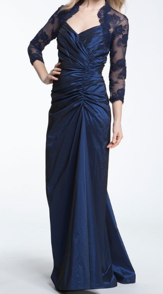 Tadashi Shoji レースタフタギャザーロングドレス ネイビー系