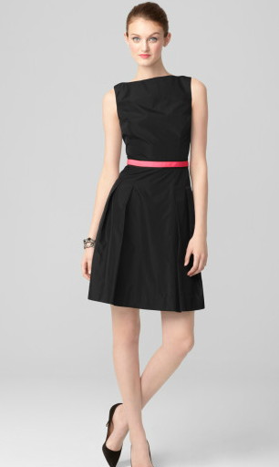 程よいマットで上品な光沢のブラックドレスに、ピンクのウエストラインがフェミニンです。