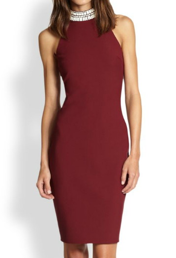 シックなボルドーカラーのレーザーバックドレスに、ネックラインのビーズが素敵です。