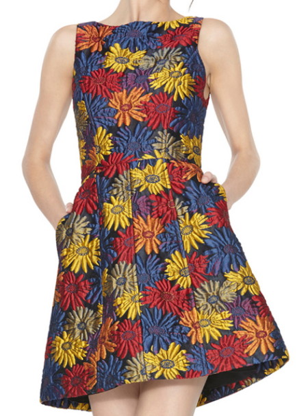 オレンジ、イエロー、レッド、ブルーなど鮮やかな花柄のサテンブロケードが美しい話題のドレスです。